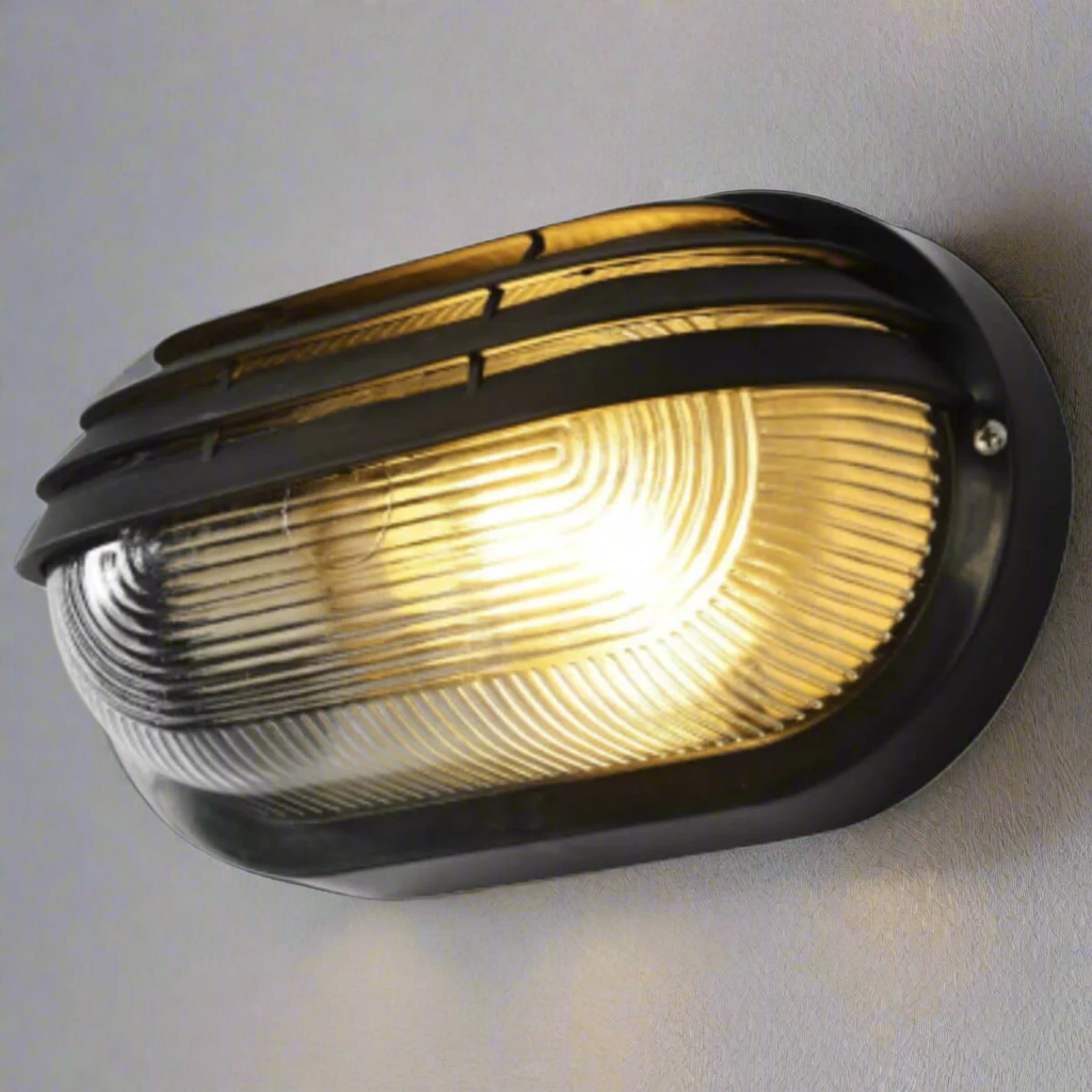 Add an industrial look to your outdoor lighting arrangements with the Bonnie Oval Outdoor Bulkhead Eyelid Wall light. This light features a durable black finish and a slatted eyelid type design that gives a robust feel to the light that looks incredibly stylish. Ideal for coastal areas, this light is also corrosion resistant and protected against most outdoor weather conditions.