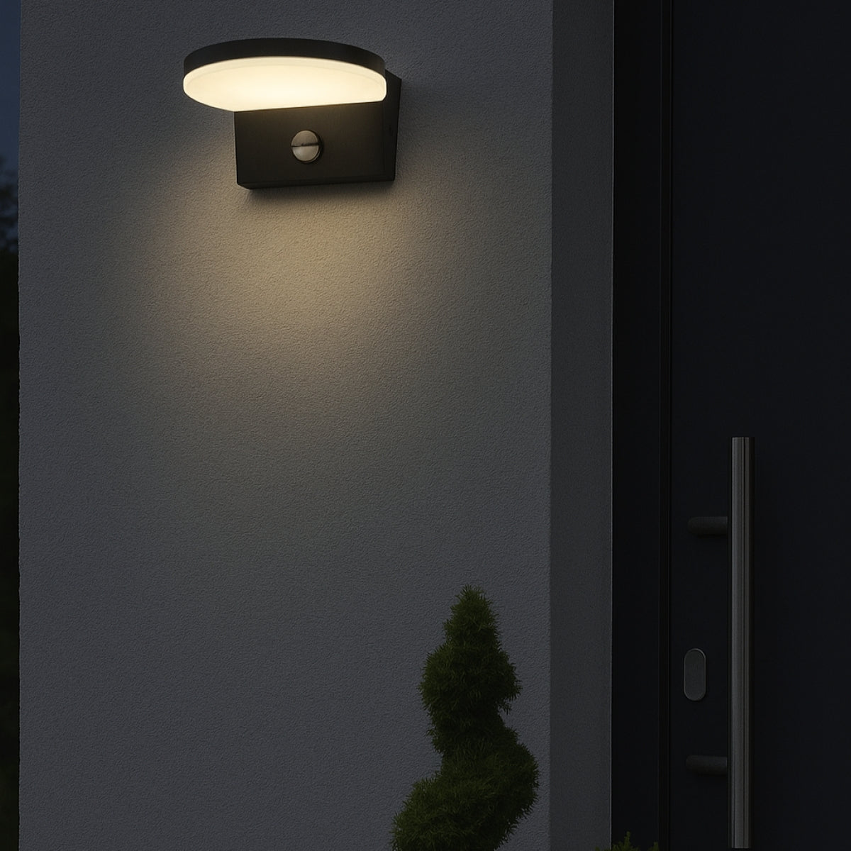 Our Aubrey black plastic ABS plastic outdoor wall mounted round outdoor light with built in LED's and motion sensor would look perfect in a modern or more traditional home design. It is designed for durability and longevity with its robust material producing a fully weatherproof and water resistant light fitting.