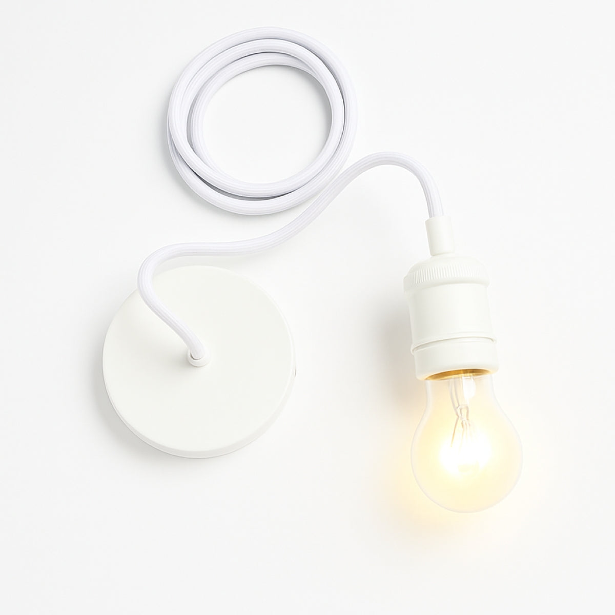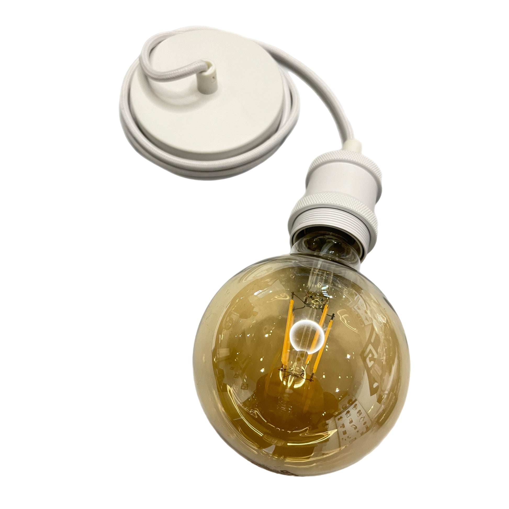 CONSTRUCTION: white metal pendant and matching ceiling rose, white braided fabric cord, includes screws, rawl plugs, connectors and ceiling bracket.