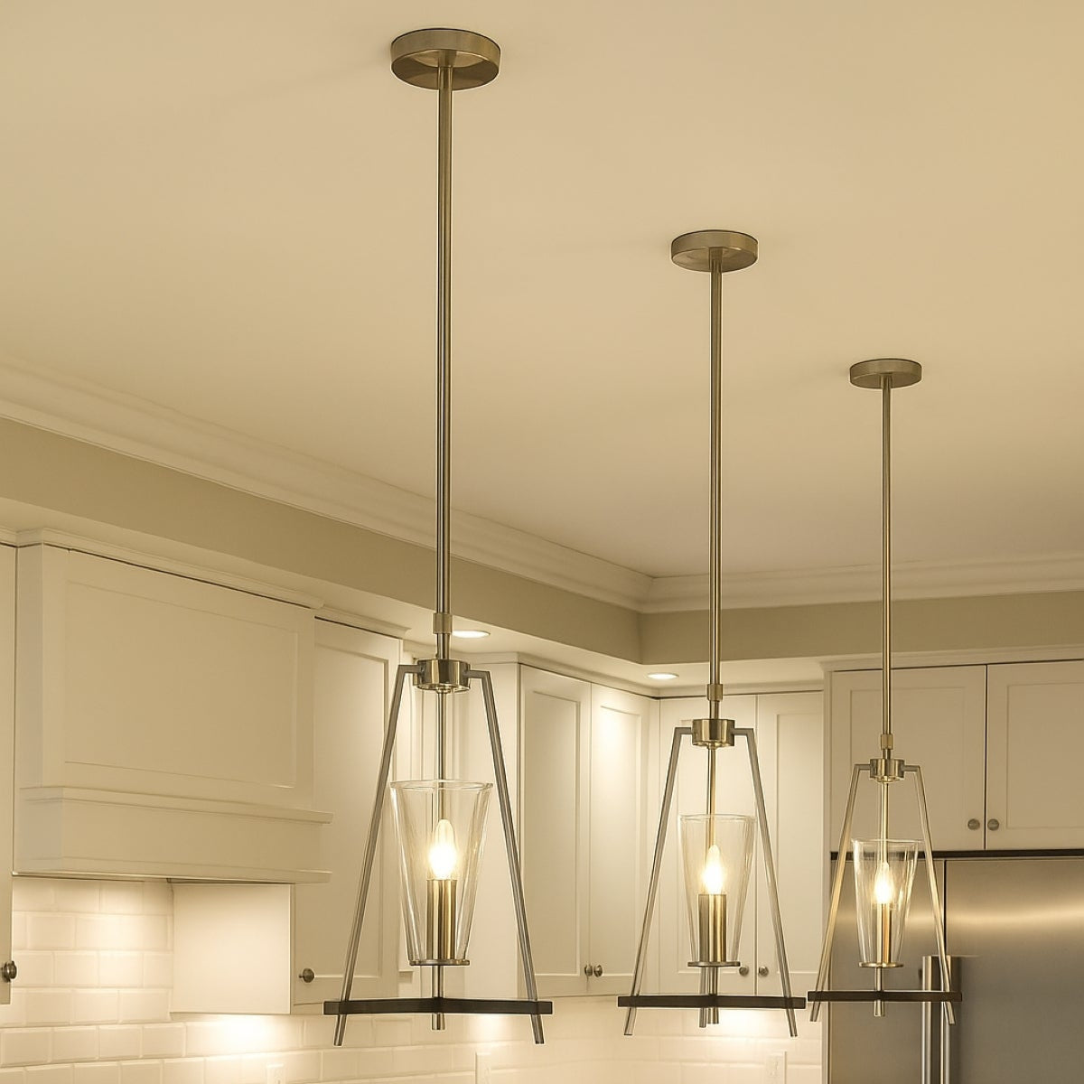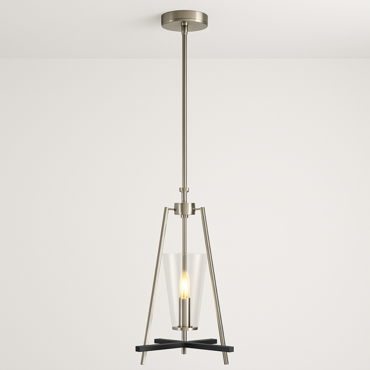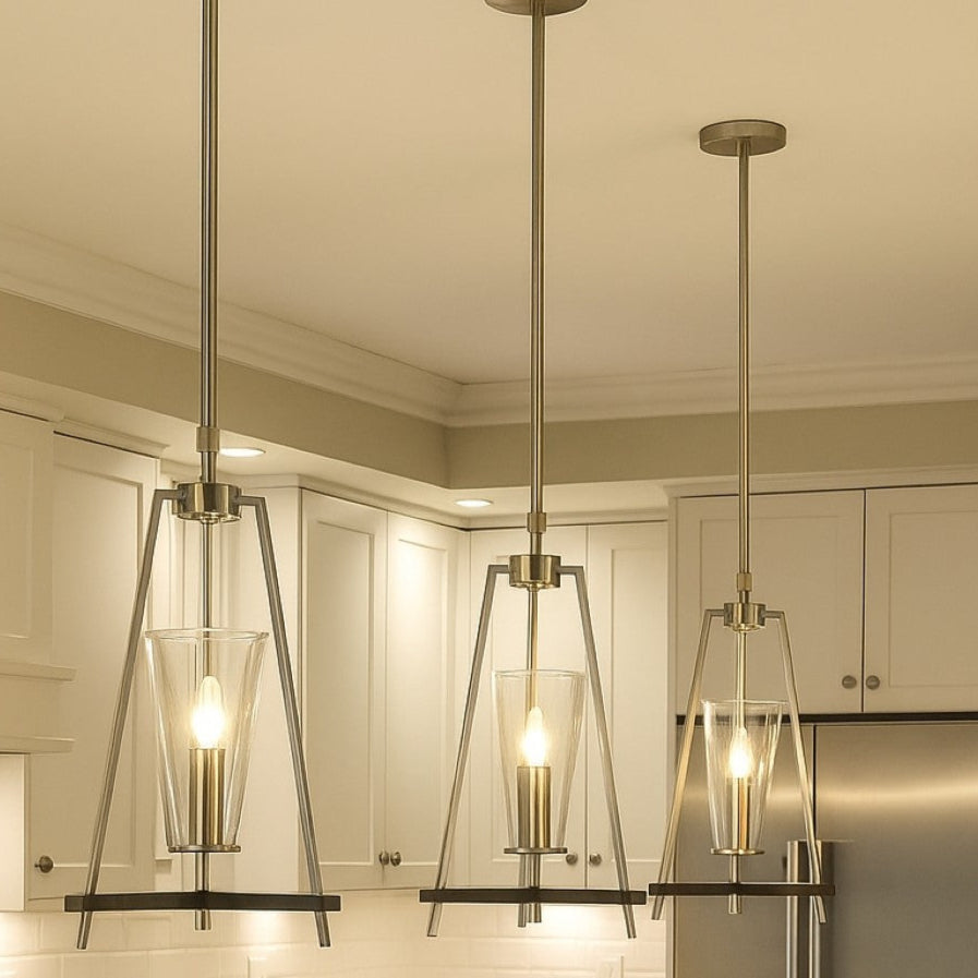 This Danika pendant light has a clear glass conical shade housed in a stain silver and black triangular design. The minimal appearance will add a touch of class and style to any room in your home. Use alone or hang several together for a statement look. The perfect pendant light for breakfast bars and kitchen islands.