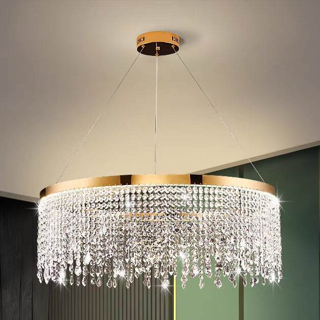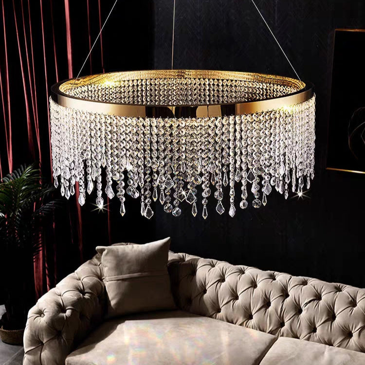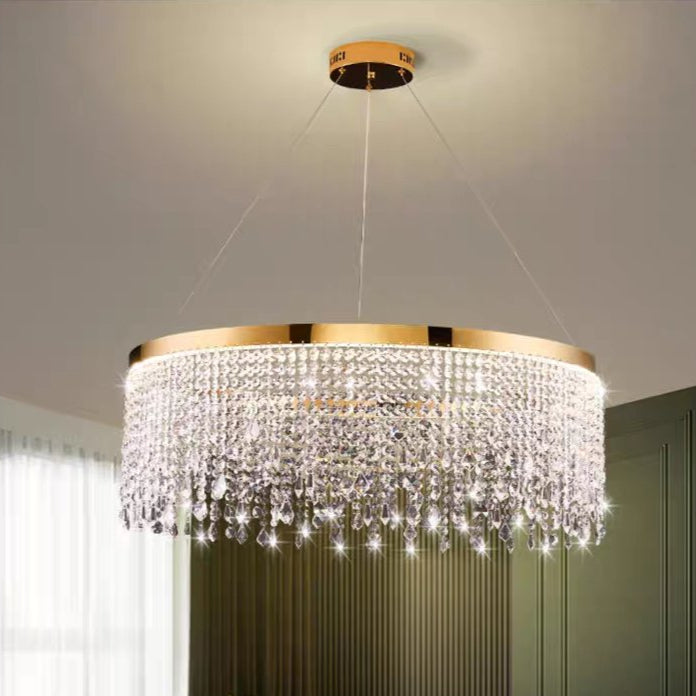This stunning ceiling light pendant boasts high-quality materials, intricate design, and a touch of luxury, making it the perfect addition to any room. The combination of delicate golden stainless steel and cascading crystals adds elegance and elevates the conversation in your interior spaces.