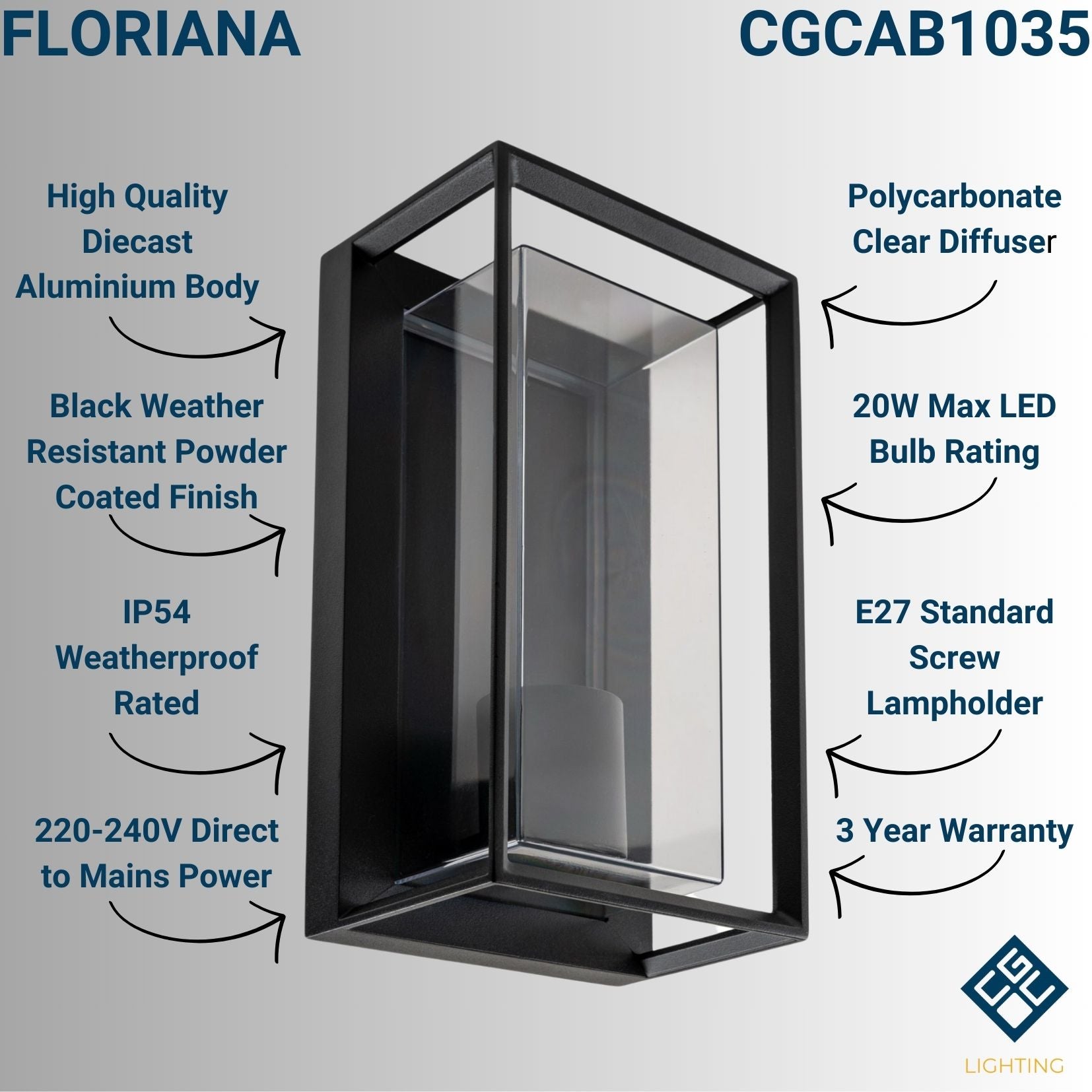 CGC FLORIANA Black Outdoor Wall Light Clear Diffuser E27 Standard Screw IP54