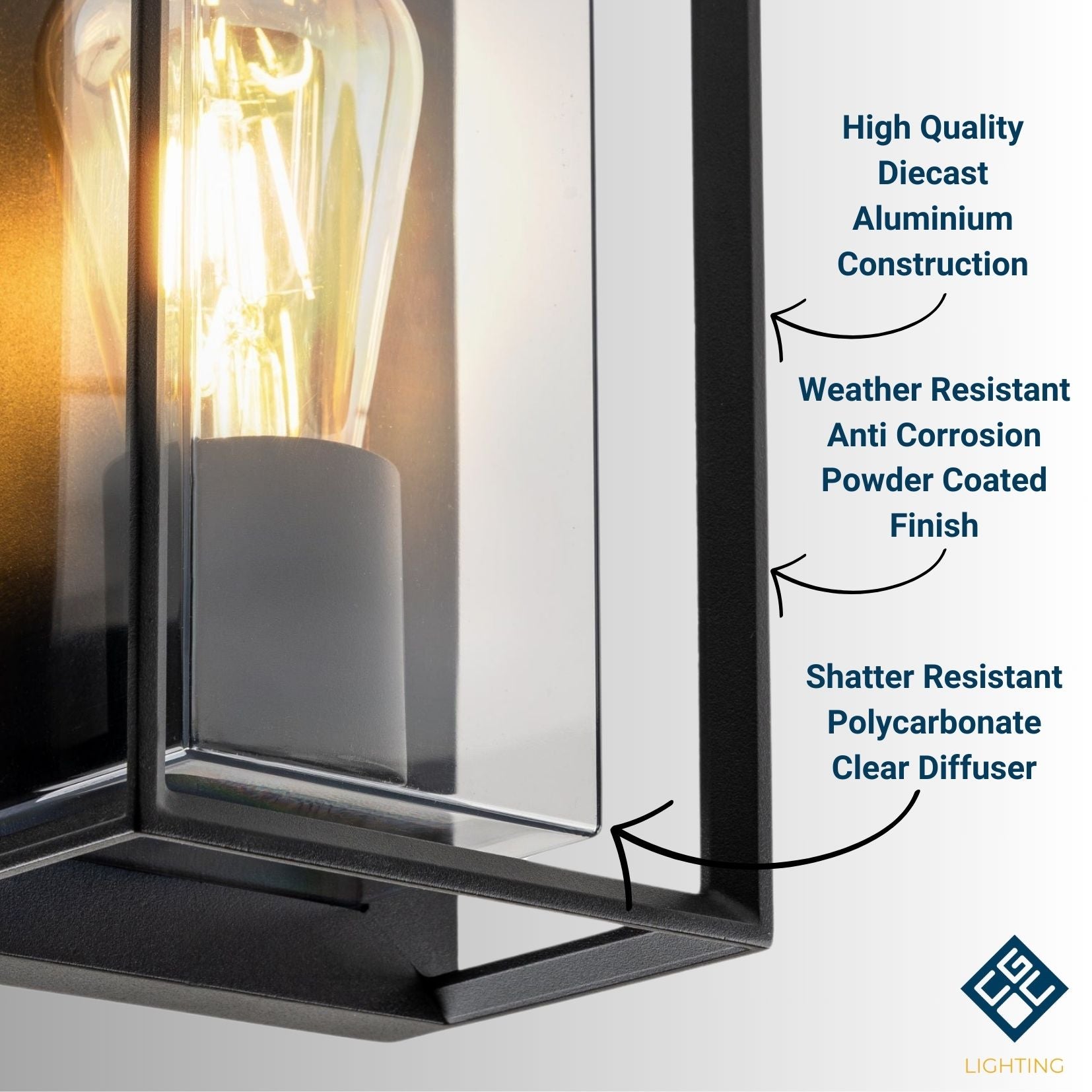 Elegant and modern square design, black weatherproof aluminium body and clear polycarbonate diffusers.