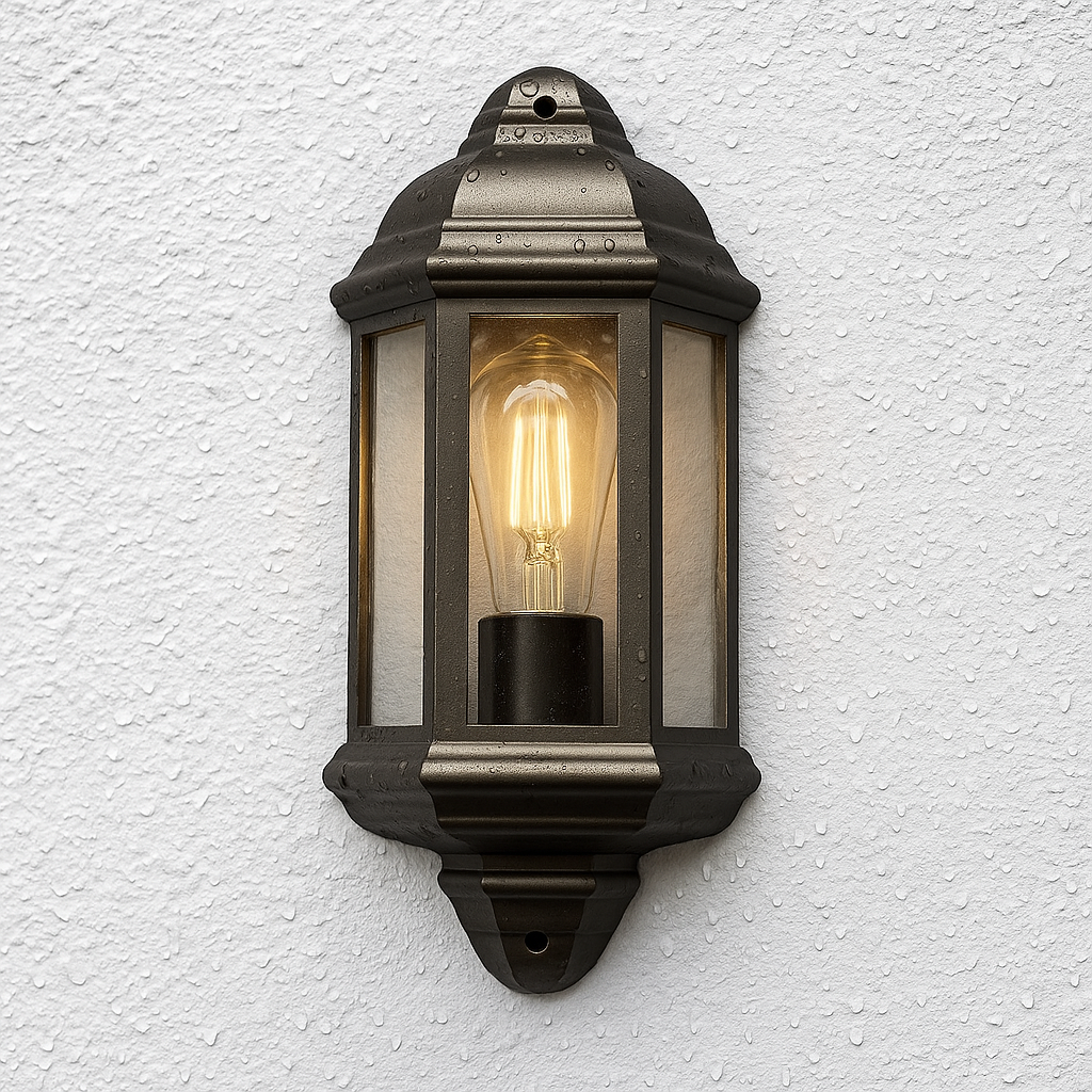 This black half outdoor wall light with clear diffuser is perfect for lighting your garden and outdoor areas. The look of the lamp is simple and classic, with elements from Victorian street lighting bringing a traditional style to the exterior of your home. The wall light is also IP44 rated and waterproof to protect against the elements. It has a built in pre-set PIR motion detector to illuminate the light once motion is detected