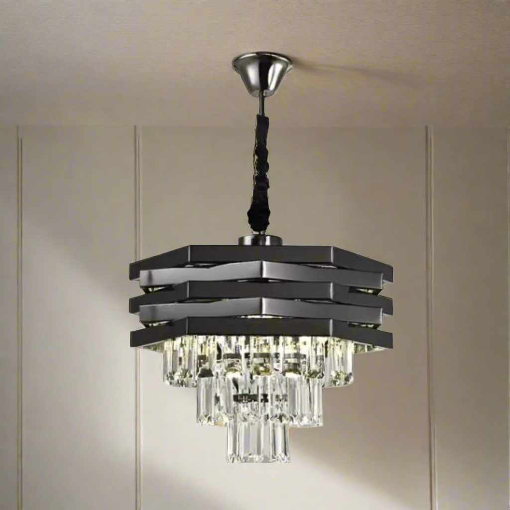 CONSTRUCTION: Modern smoked grey design with clear cascading crystals