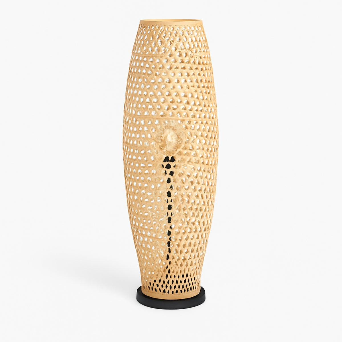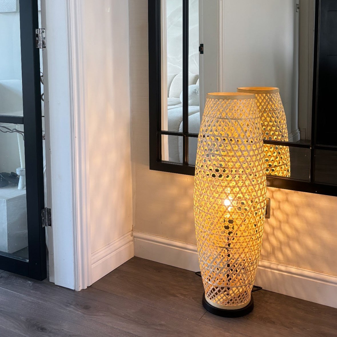 This Large Bamboo Floor Lamp offers versatility and functionality as it enhances and adorns your living areas. Its cylindrical shape showcases a natural weave of bamboo, providing a cozy and inviting ambiance. Crafted from premium quality bamboo, this floor lamp seamlessly integrates with your existing furniture and is ideal for placement in living rooms, hallways, or bedrooms. Incorporating natural materials is a popular trend in home decor, adding a charming touch and a unique character to any space.
