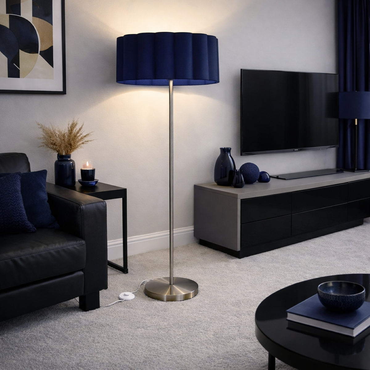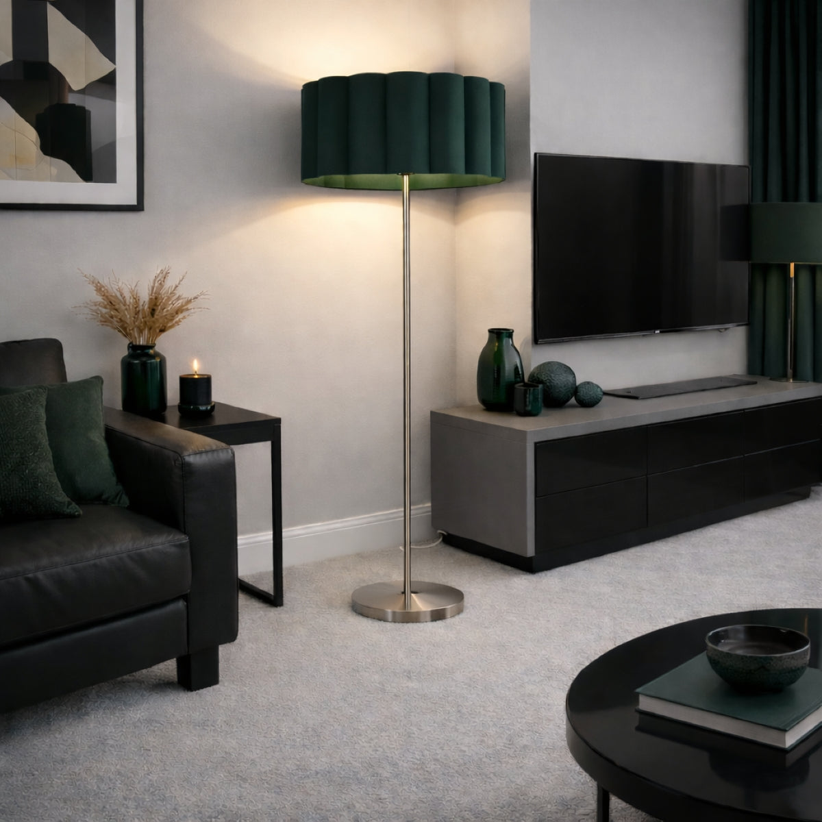 The Lena floor lamp paired with our large scalloped shades combines high quality materials and on trend design. The floor lamp is finished in brushed nickel, and the large scalloped shades with matching inner linings create a stunning illumination.