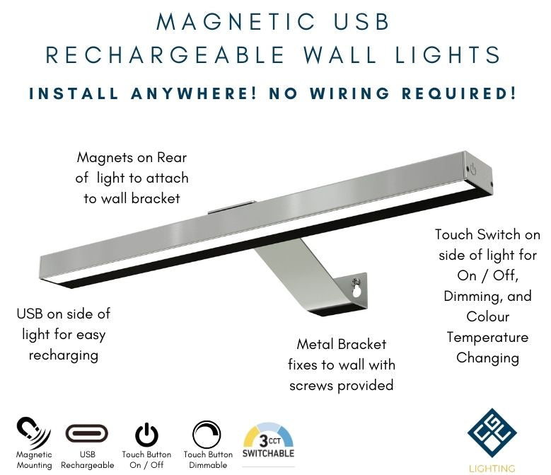 It's innovative magnetic mounting function makes it easy to remove to recharge, each full 3 hour charge lasts 15 hours. Designed for over mirrors or pictures this light is not only aesthetically pleasing but also the perfect lighting solution for those dark spots in your home.