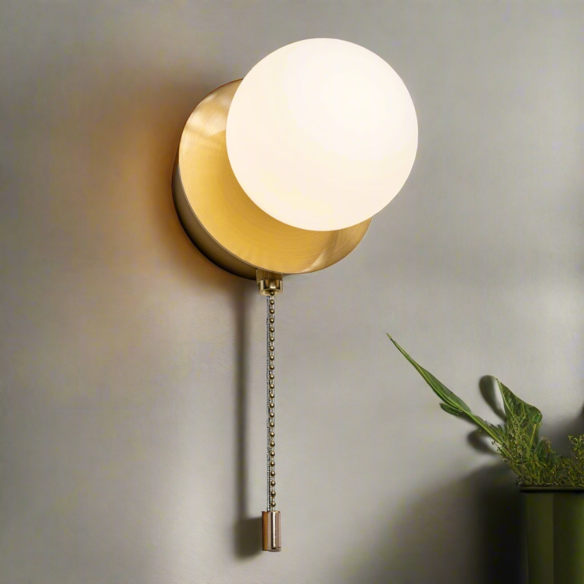 CGC MACIE Satin Gold & White Opal Globe LED Rechargeable Magnetic USB Reading Bedside Wall Light Pull Cord Switch