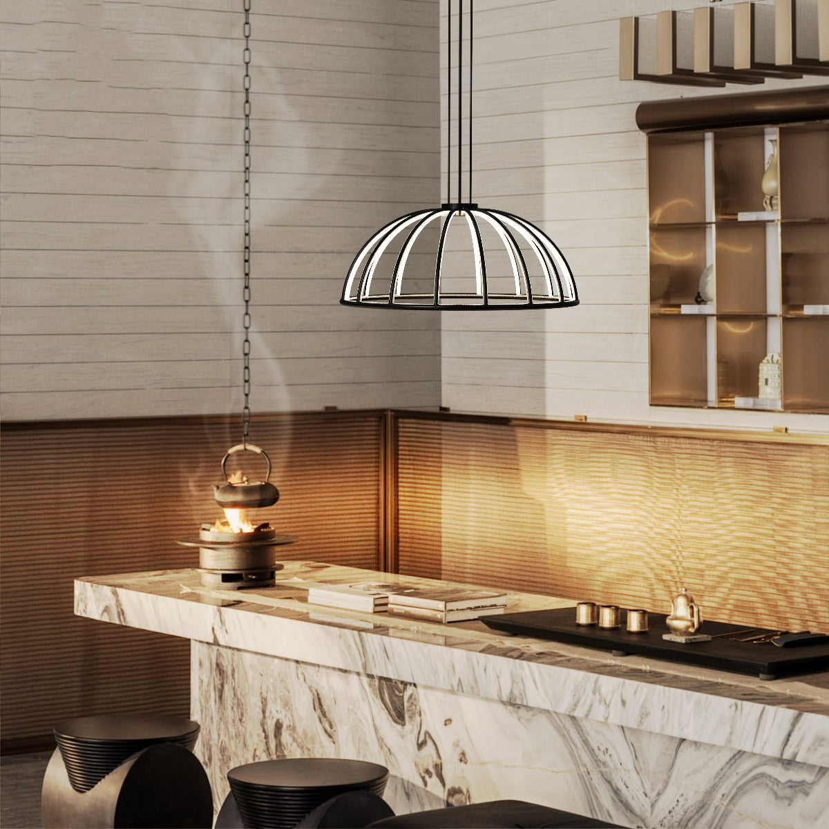 CONSTRUCTION: Modern hemisphere shaped metal pendant with integrated LED