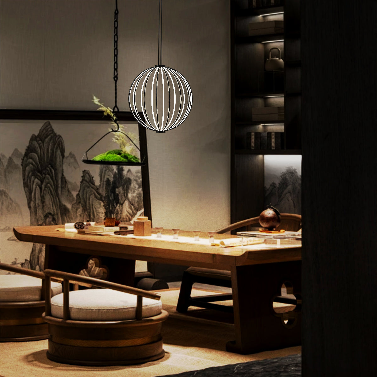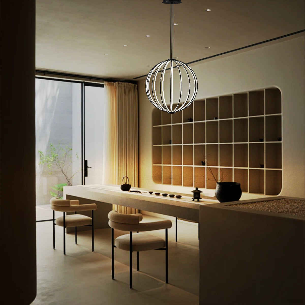 CONSTRUCTION: Modern globe shaped metal pendant with integrated LED