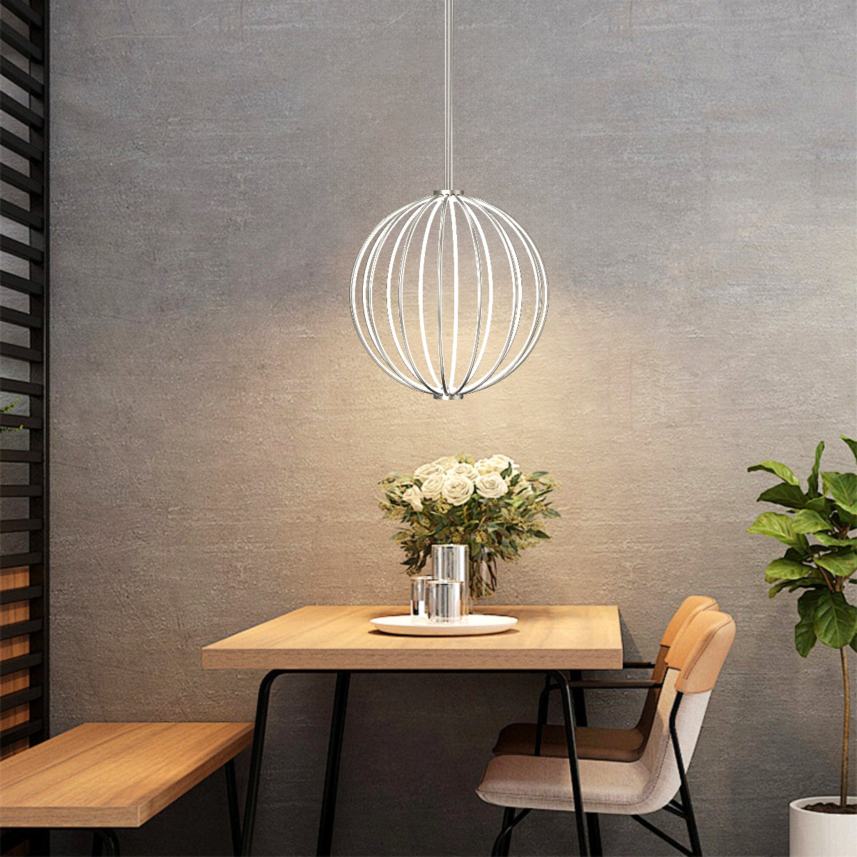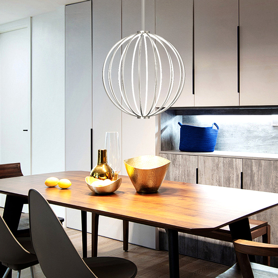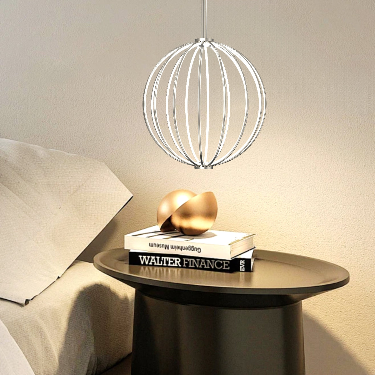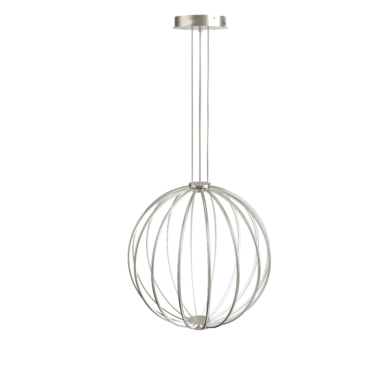 CONSTRUCTION: Modern globe shaped metal pendant with integrated LED