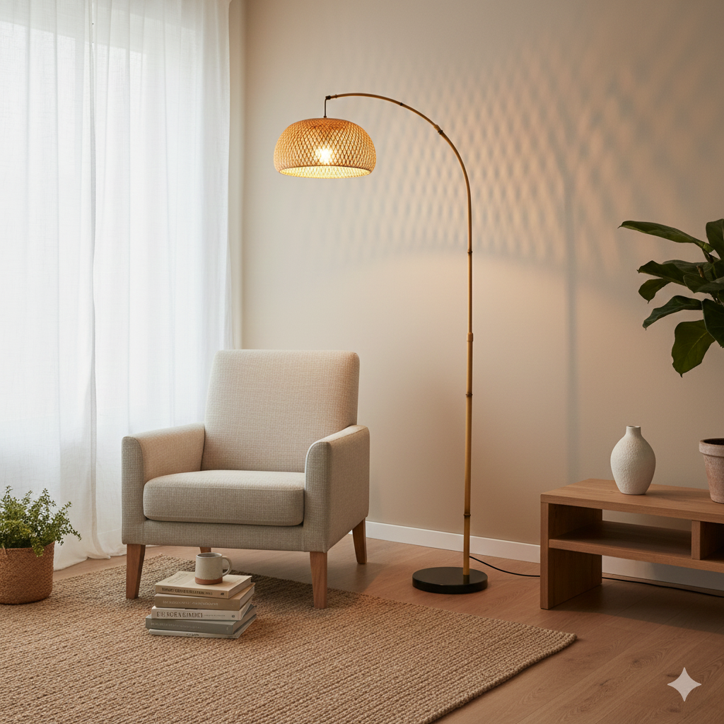 This bamboo style curved floor lamp will add a extra warm glow to your space with stunning refection's of light.