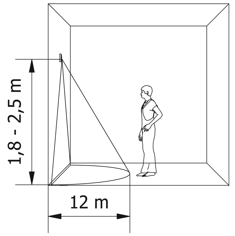 The maximum range of motion detection is 12 meters. The device is resistant to outdoor conditions thanks to its IP65 rating, which allows it to be used both indoors and outdoors. It operates at temperatures from -20°C to +25°C, which guarantees reliability in various climatic conditions.