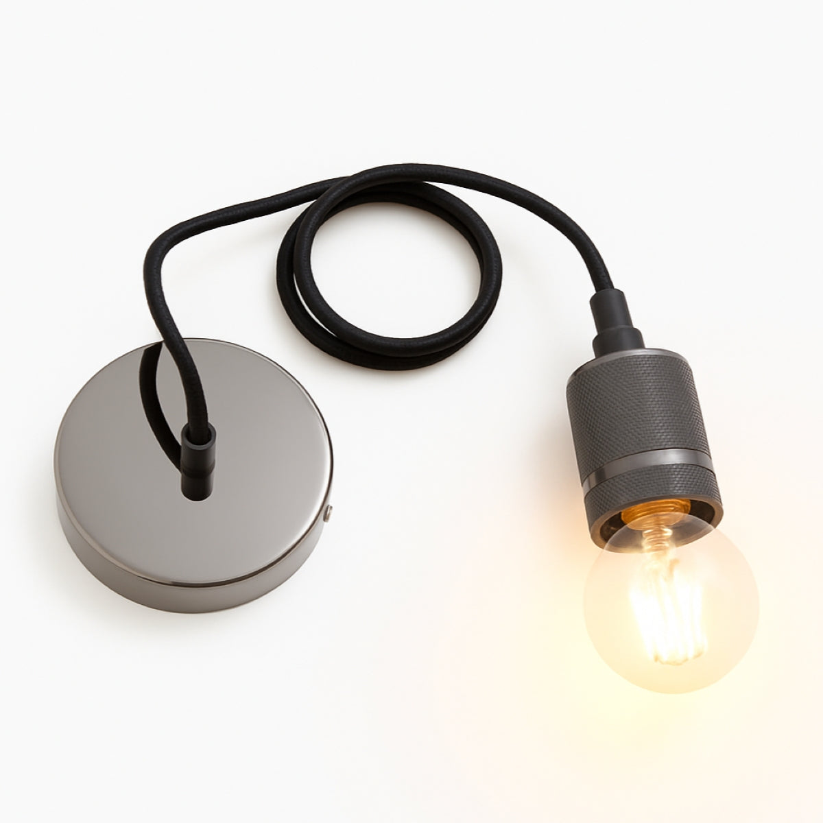 CONSTRUCTION: Black metal pendant and matching ceiling rose, black braided fabric cord, includes screws, rawl plugs, connectors and ceiling bracket