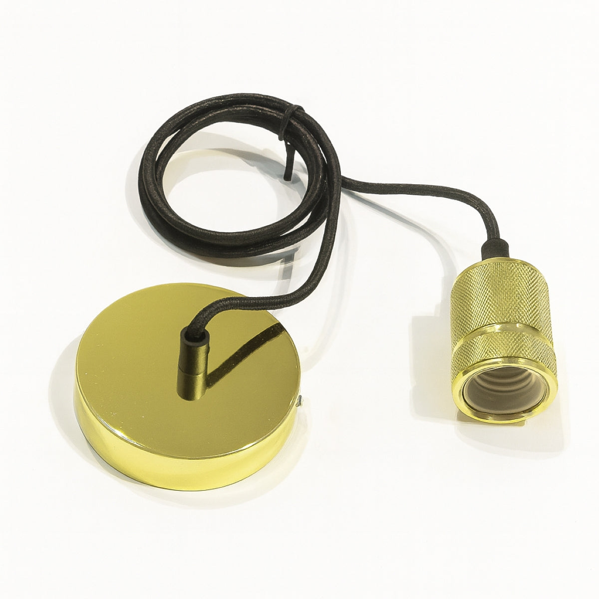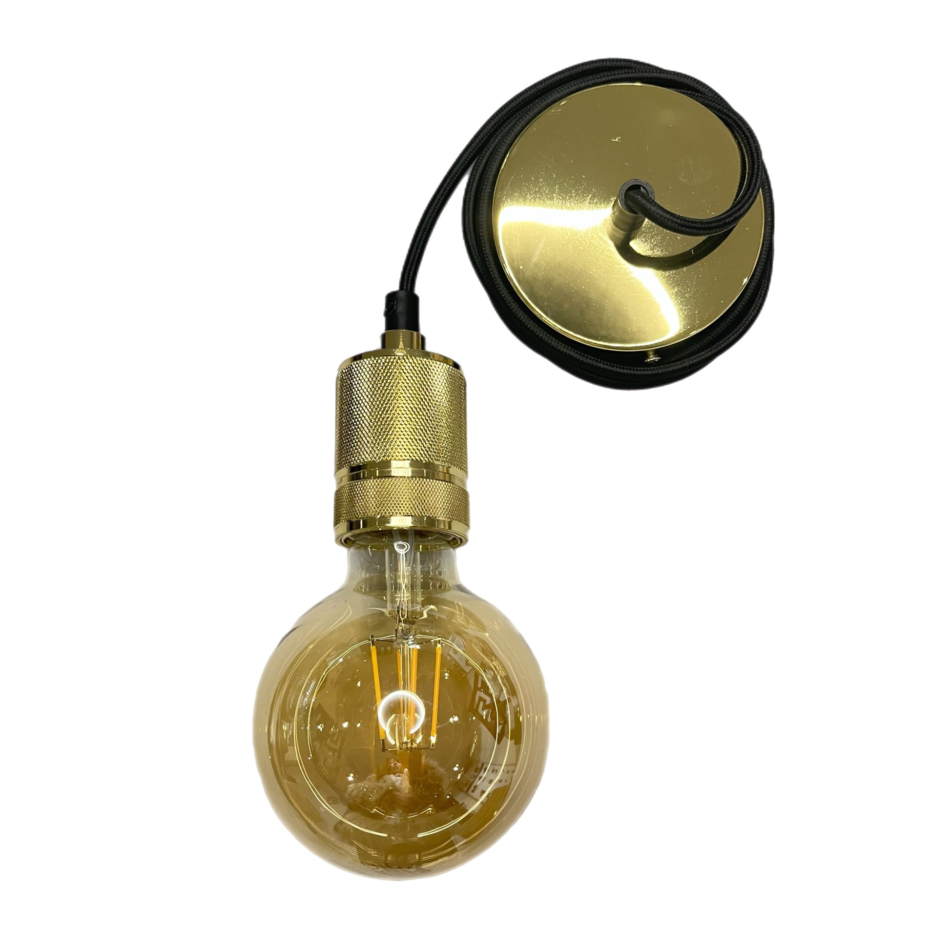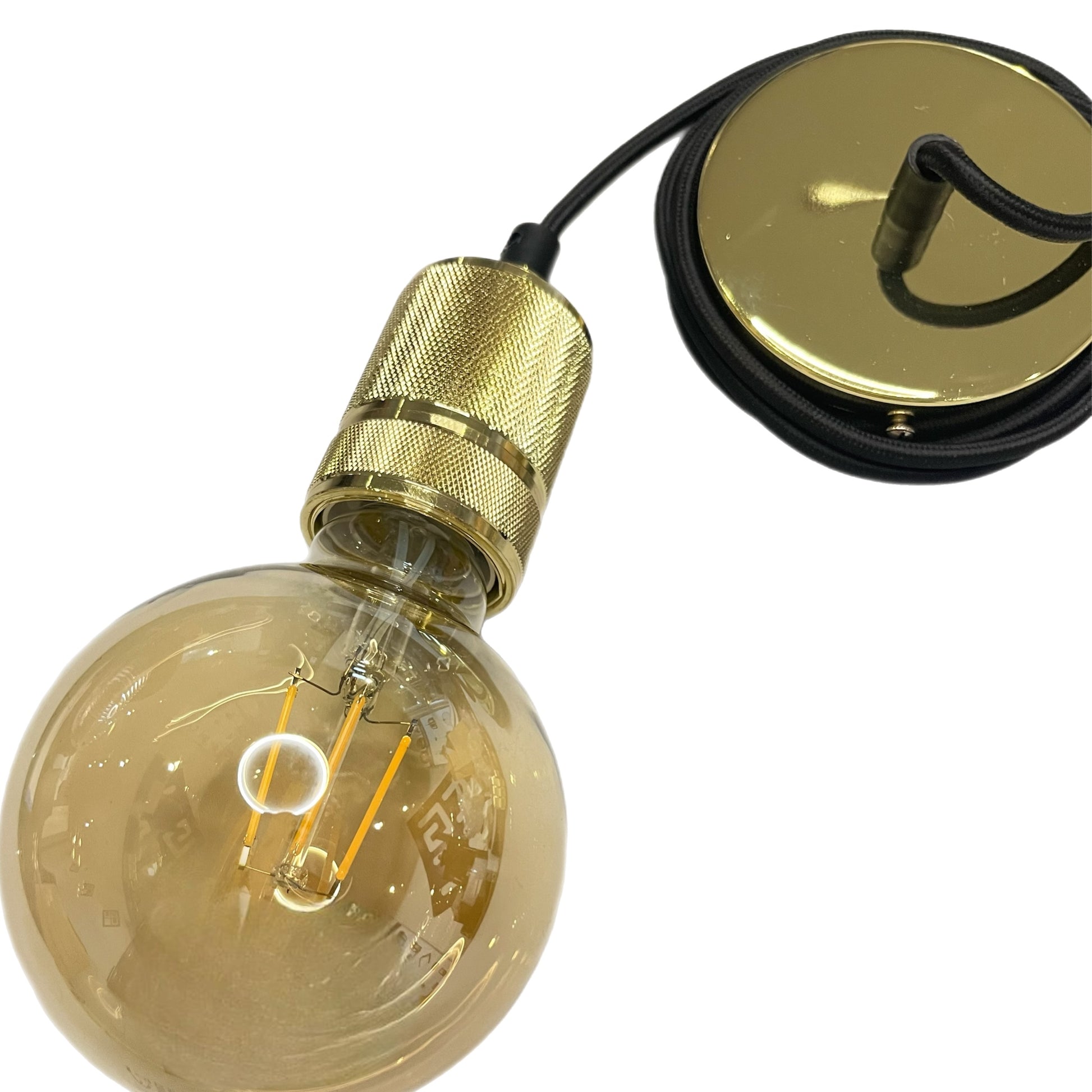 CONSTRUCTION: Gold metal pendant and matching ceiling rose, black braided fabric cord, includes screws, rawl plugs, connectors and ceiling bracket