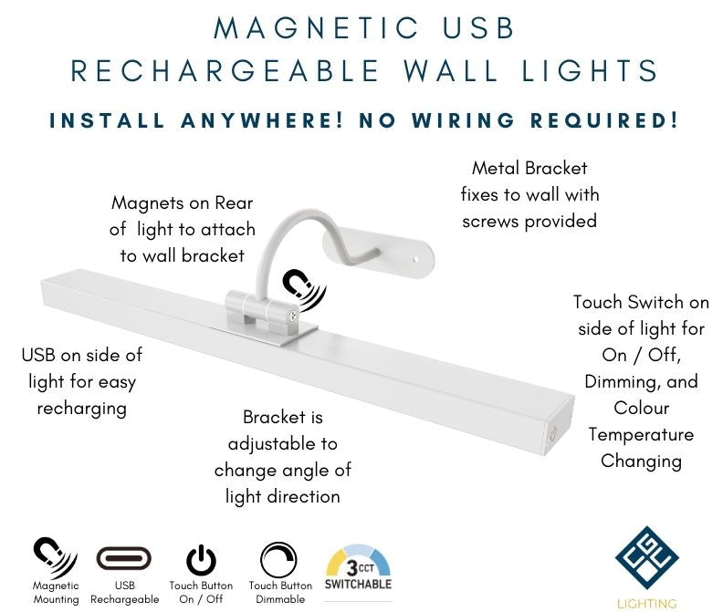 CGC VIRGO Curved White LED Rechargeable Magnetic USB Over Picture Wall Light