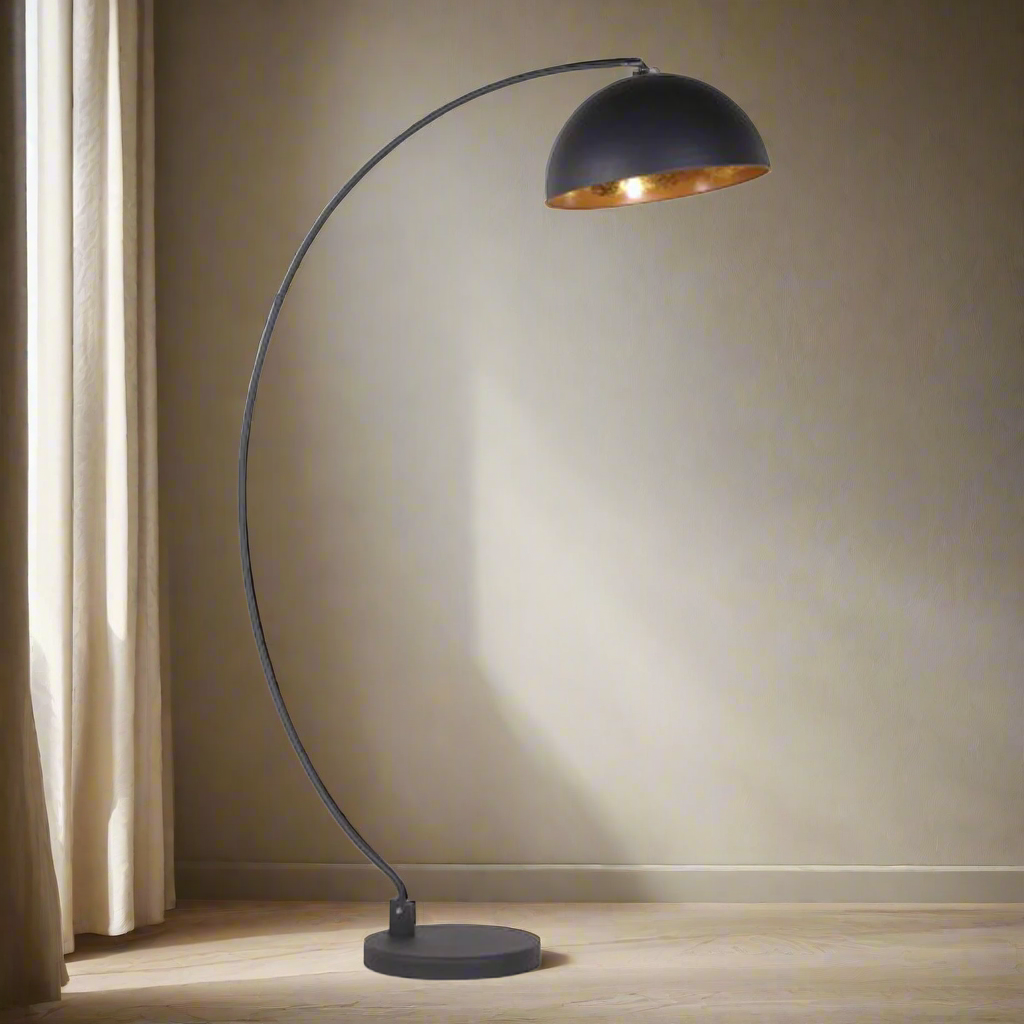 This matt black curved floor lamp with its gold distressed look inner shade will add a extra warm glow to your space with stunning refection's of light.