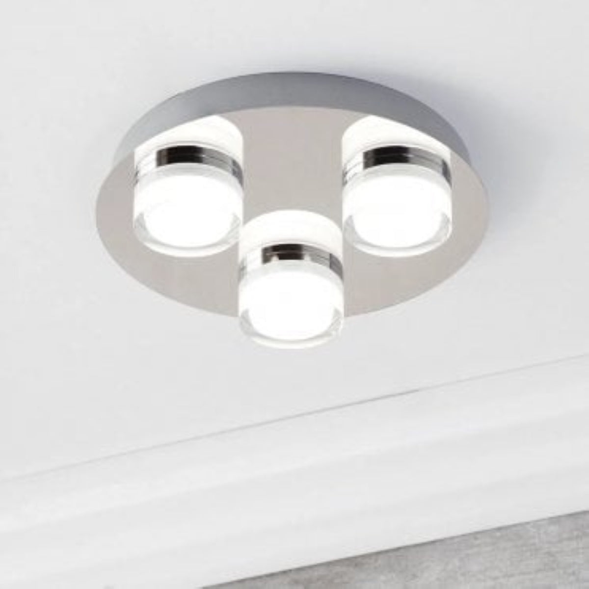 CONSTRUCTION: Modern round chrome fitting and triple light design with opal diffusers