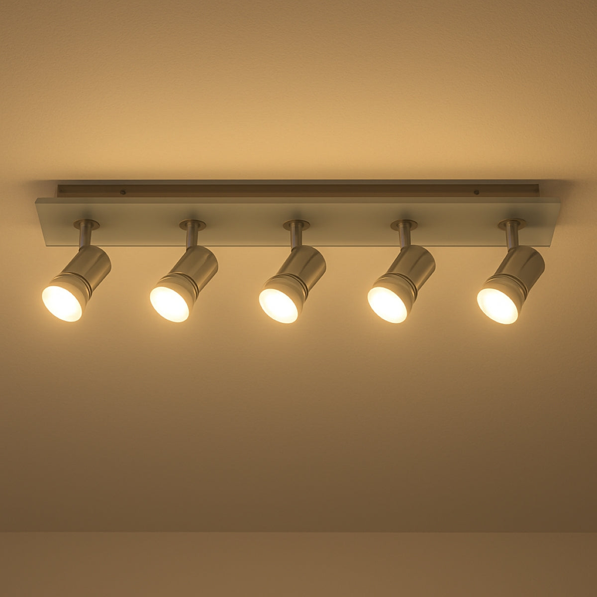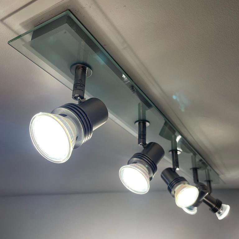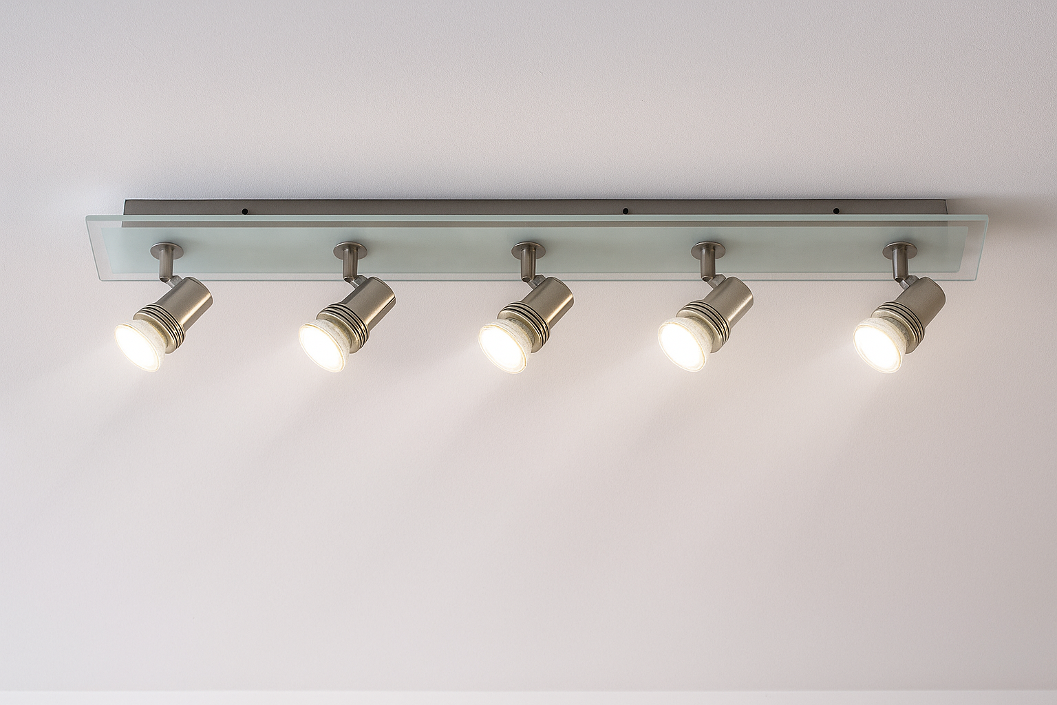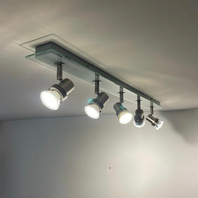This Top Hat satin silver 5 light spotlight with clear and frosted oblong glass back plate is modern and classic. The five GU10 heads are fully adjustable, so you can find the perfect angle for the spotlights. And the fitting has a stylish satin silver finish, with a long clear and frosted glass back plate to complete the look. This product accepts a Max 7W LED or 50w Halogen GU10.