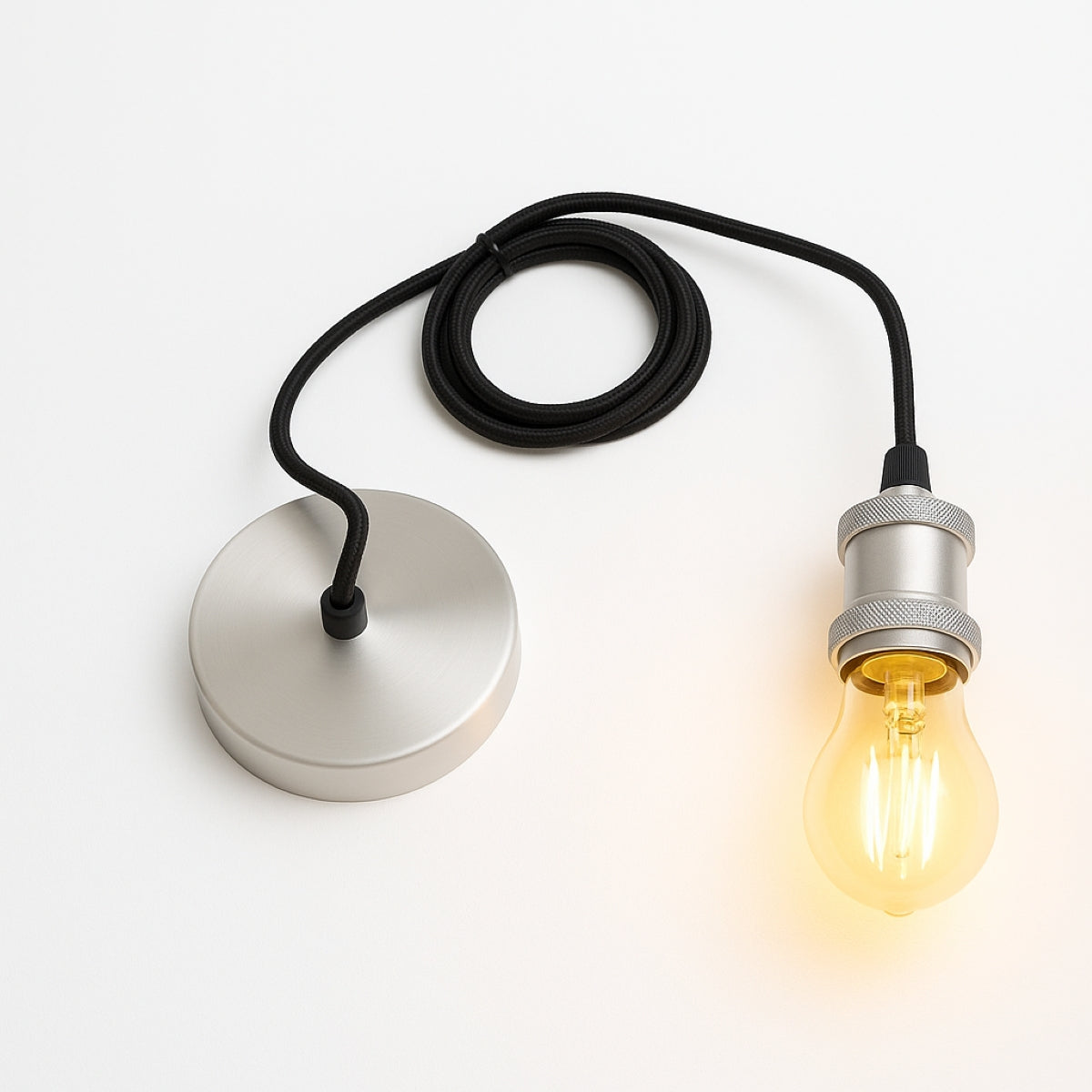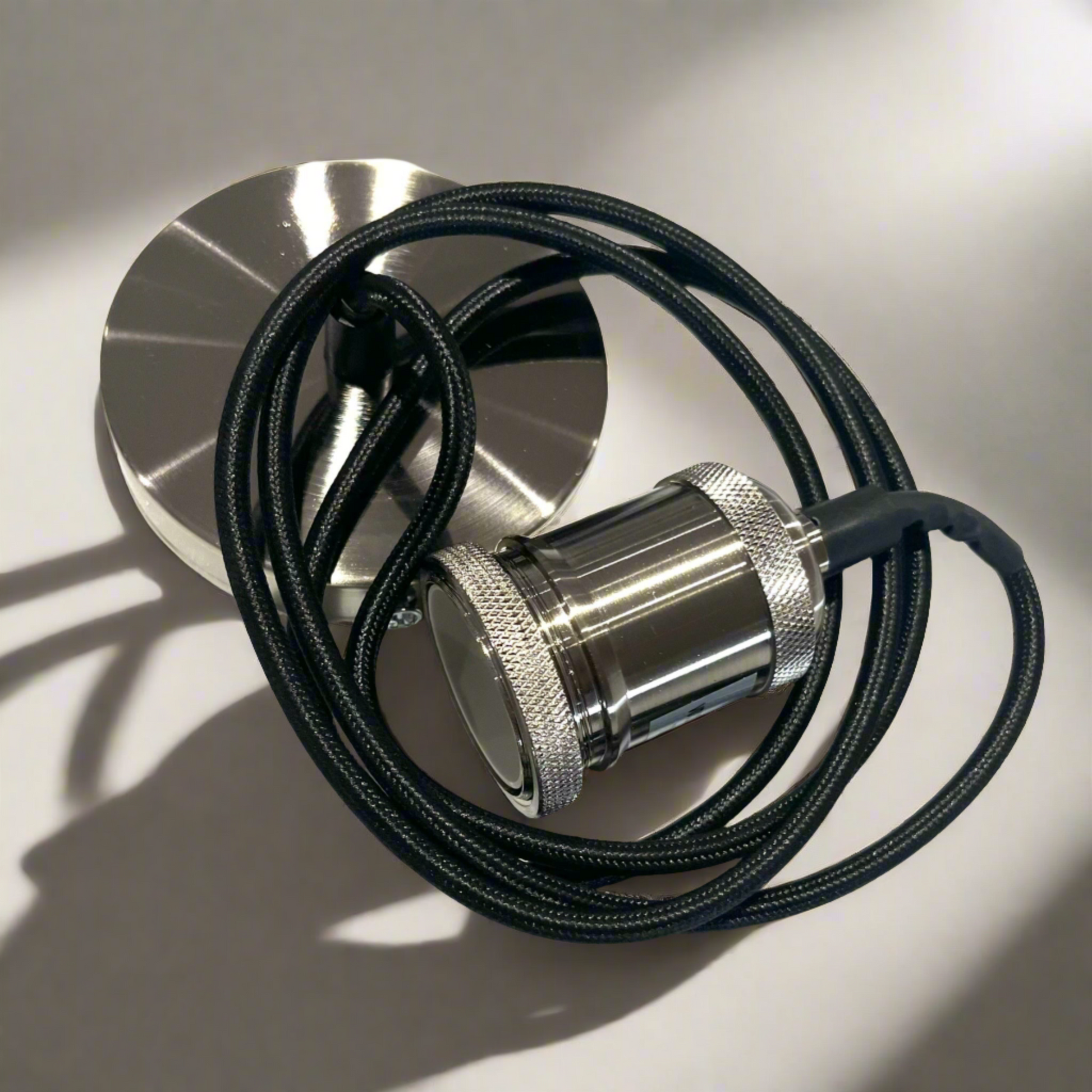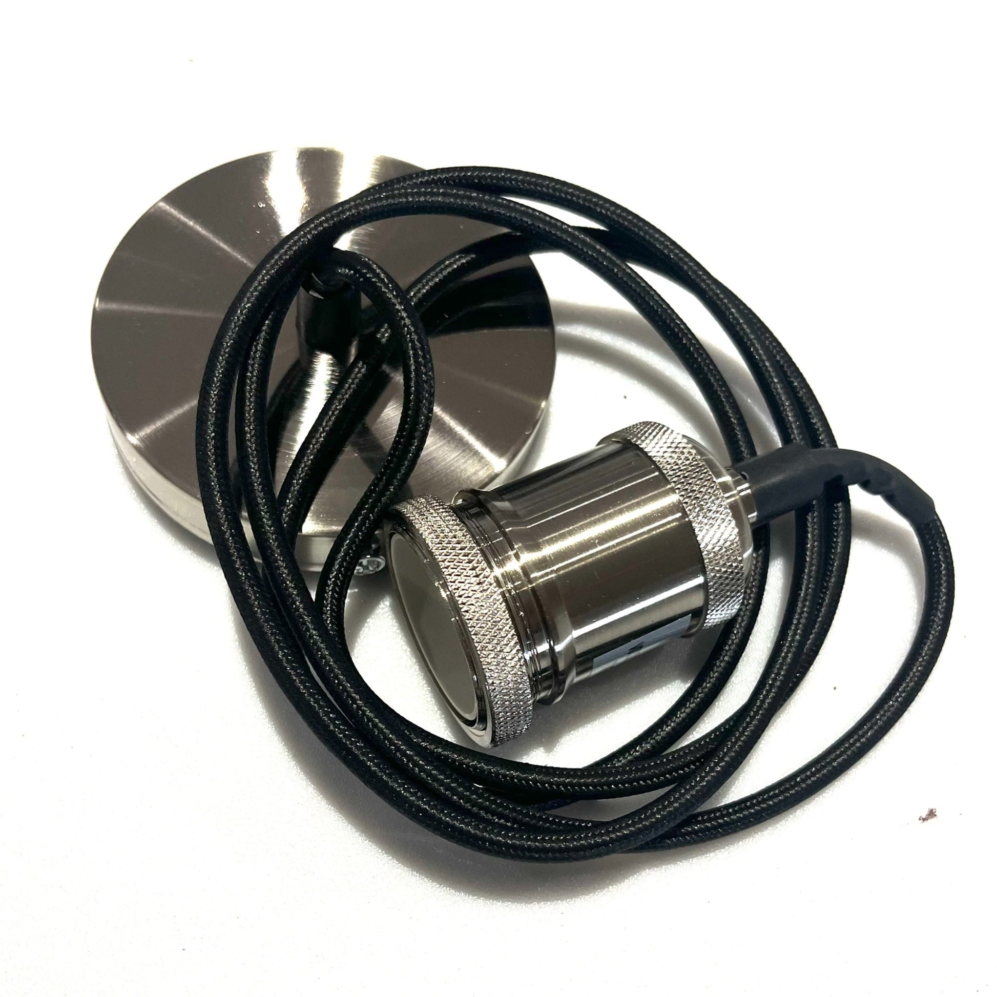 CONSTRUCTION: Satin silver metal pendant and matching ceiling rose, black braided fabric cord, includes screws, rawl plugs, connectors and ceiling bracket.