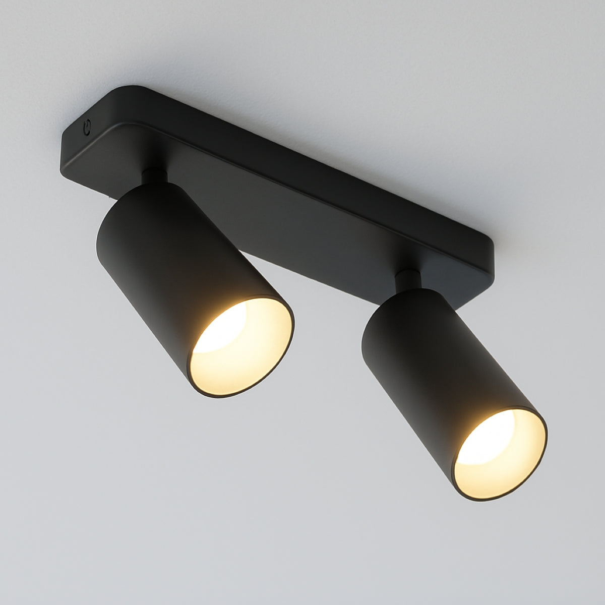 The black Nell twin lamp consists of two cylindrical spotlights, both of which can be tilted and adjusted on their own axis. The spotlights are attached to a rectangular bracket, which makes them equally suitable for mounting on walls and ceilings.