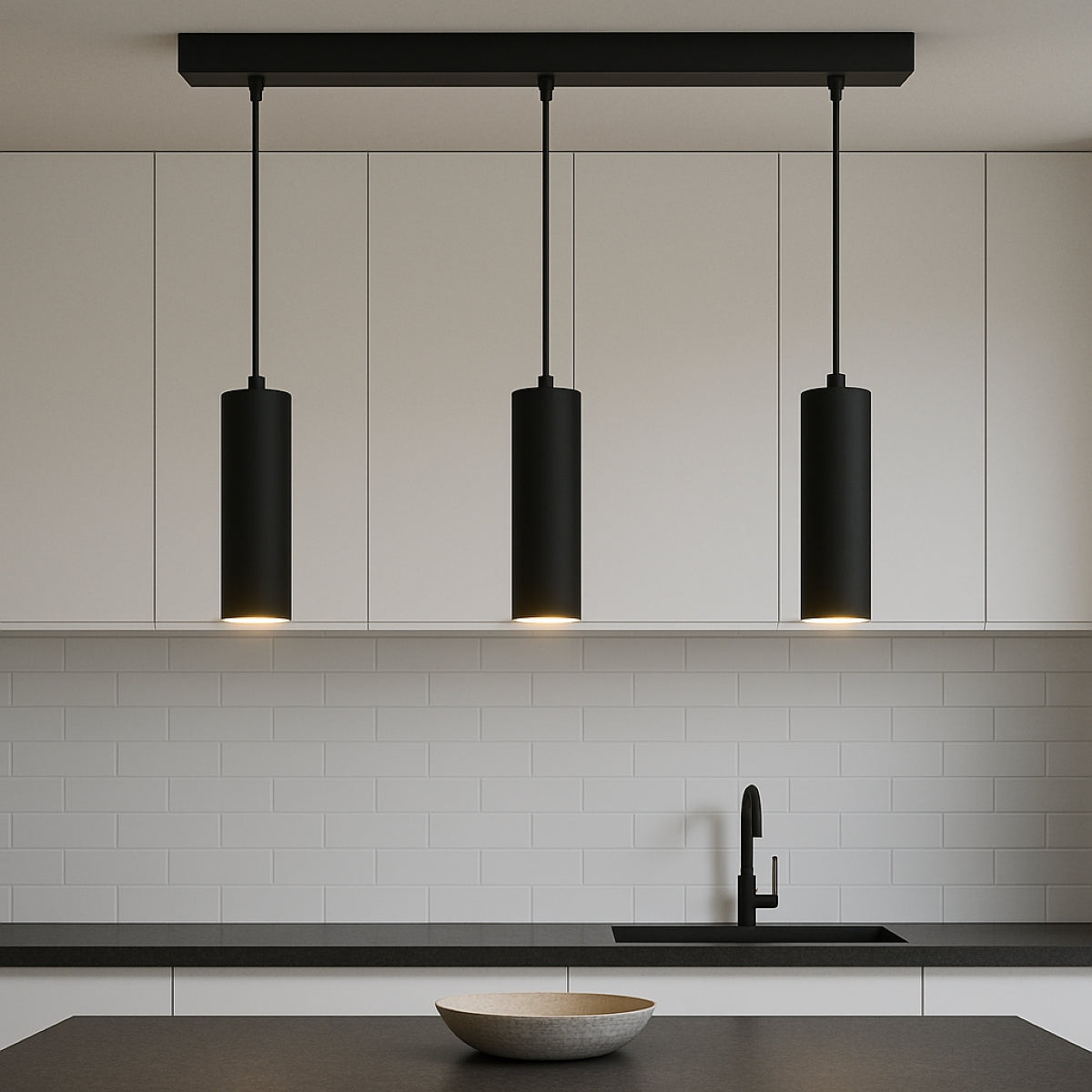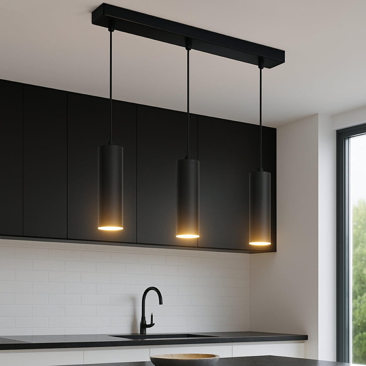 High-quality black ceiling triple hanging spotlight pendant. A cylinder pendant with a modern and sleek design would add a huge element of style and class to any room. Made of aluminium with a powder coat finish. Height can be adjusted during installation.