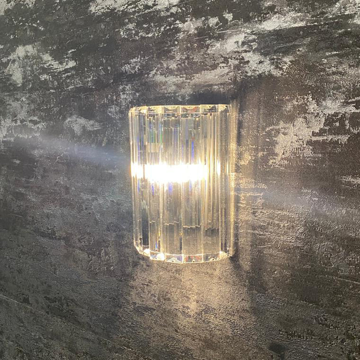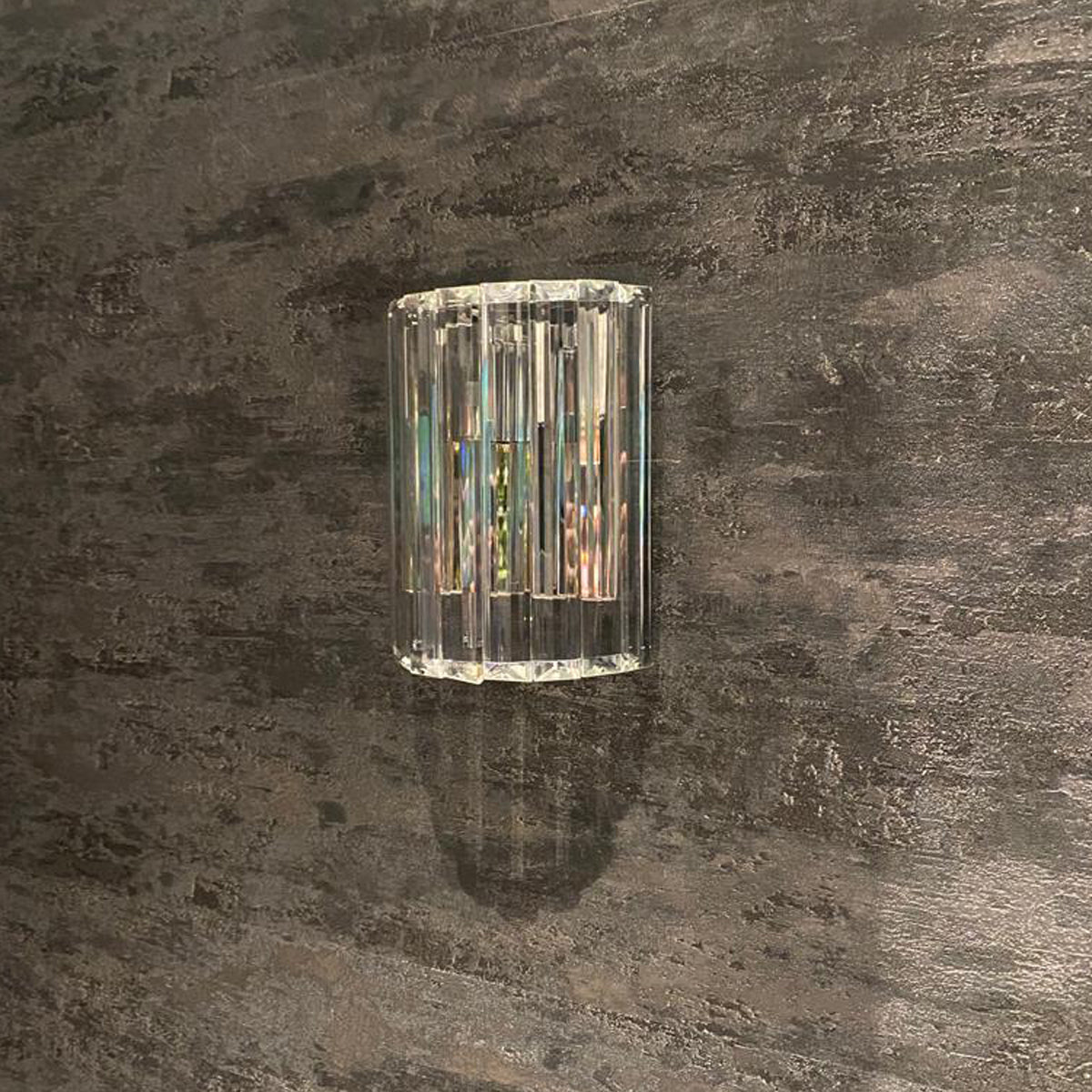 The semi-cylindrical shade of the wall lamp is formed from long, triangular crystal rods, in whose surface the emitted light is refracted, producing wonderful reflections. On the bottom, round crystals provide an additional reflection.
