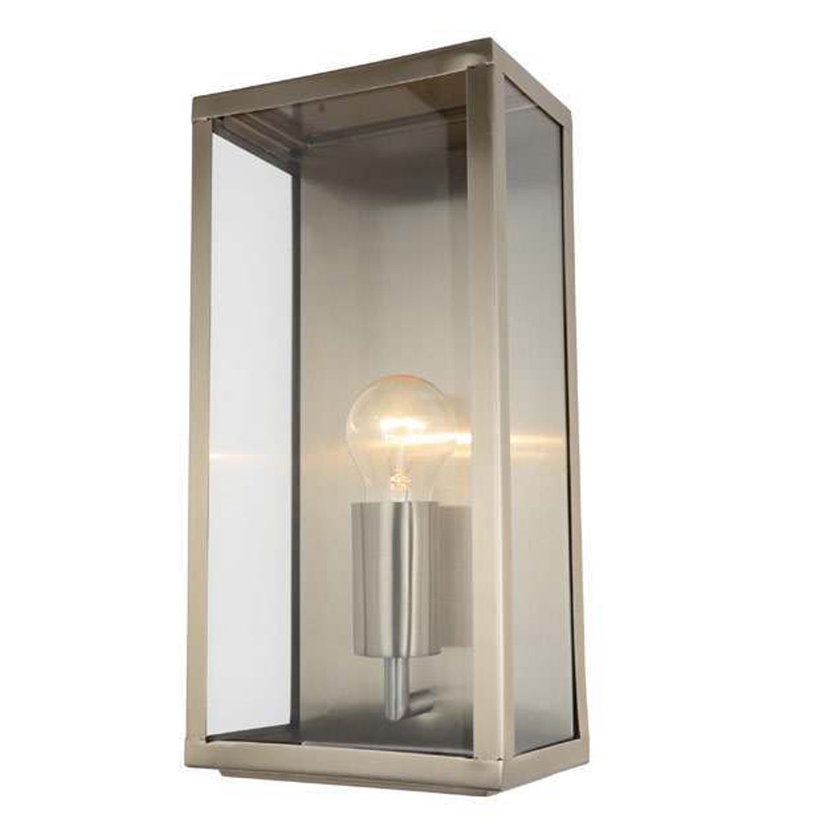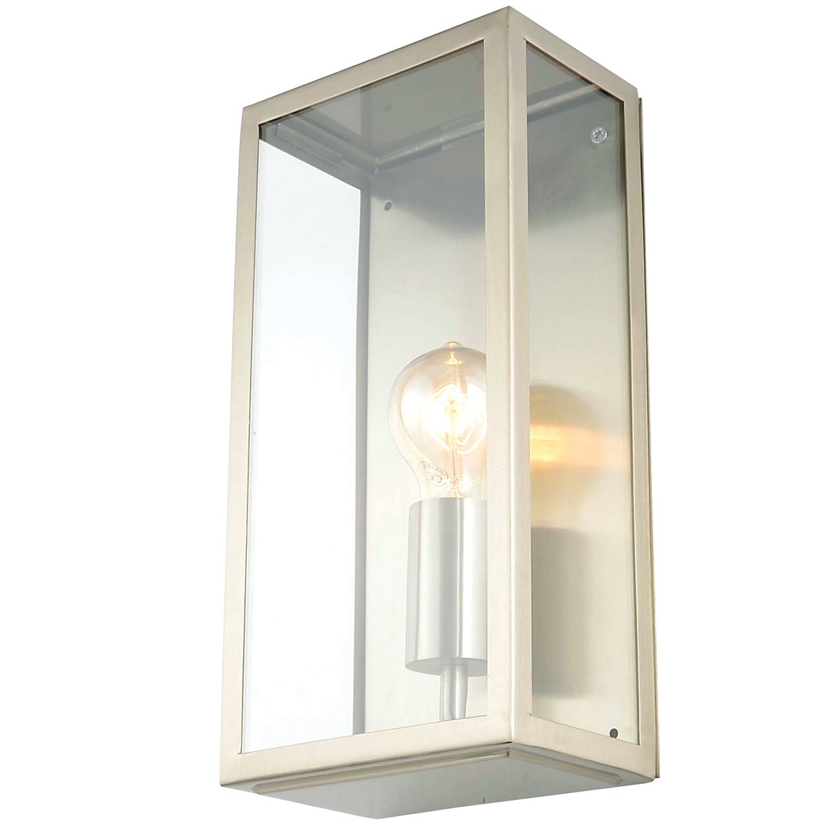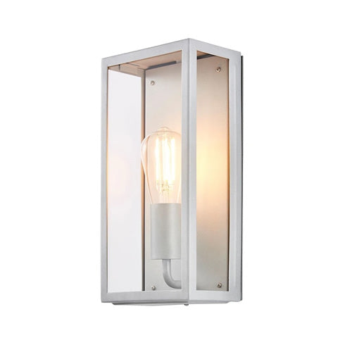 The Irene Outdoor Wall Light features a boxed wall structure made from glass panels and a beautiful matt silver/grey finish, adding a stylish look to your outdoor space. It is designed for durability and longevity with its robust material producing a fully weatherproof and water resistant light fitting.