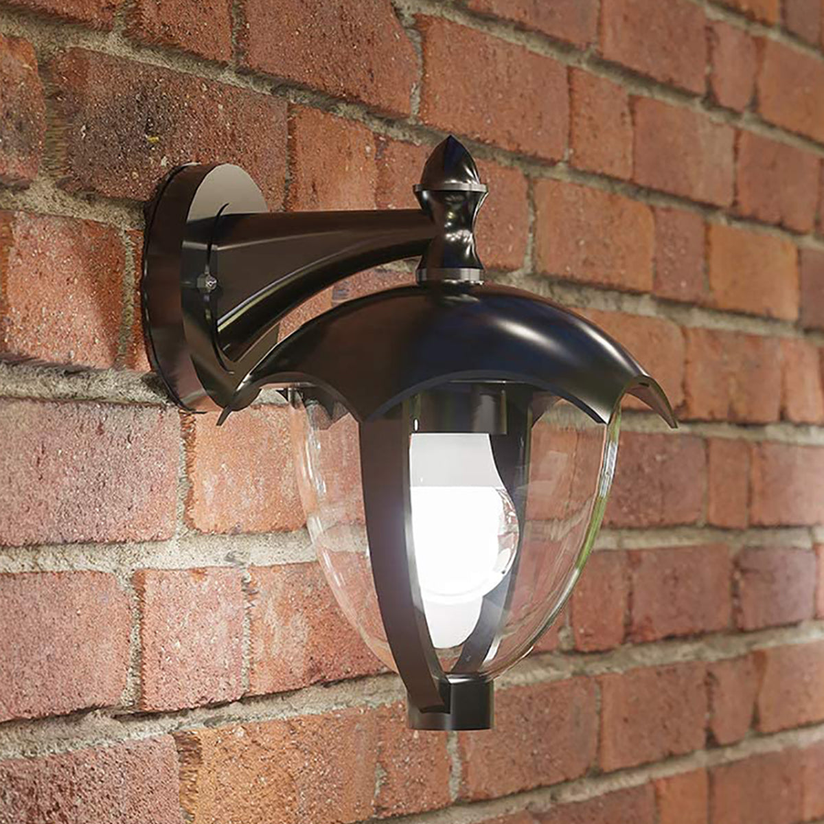 Poppy black curved coach lantern is an elegantly simple fitting with a black powder coated finish and clear glass diffusers. This stylish wall light is perfect for adding a pinch of modern flavour to doorways, sheds, patios, porch, driveways, garages, sheds, and more. This fitting is IP54 rated which makes it fully weatherproof light fitting.