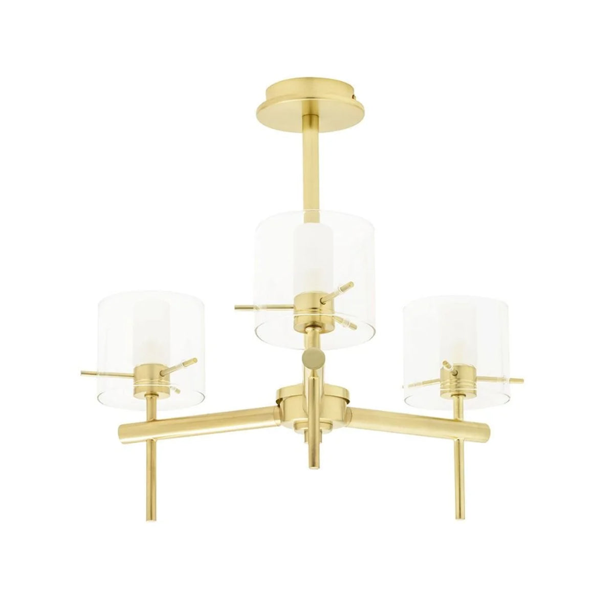 Add a contemporary feature to your interior with this triple ceiling light. The shades are artistically designed in clear glass, with three light outputs for a contemporary take on a classic design. Ceiling rose and fittings are available in an antique brass or a polished chrome finish.
